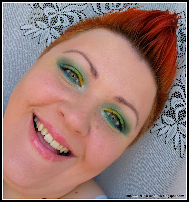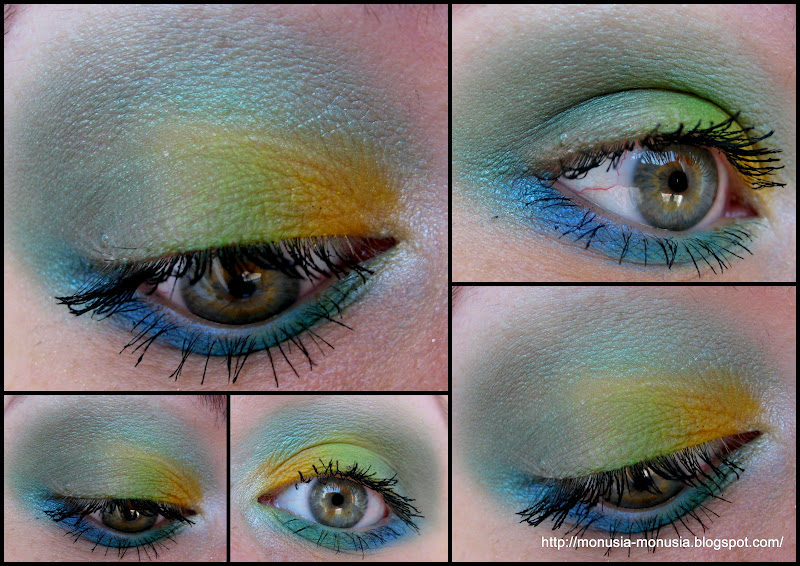 Kolorystyka do głownie zielenie, niebieskości oraz turkusy – jak to morze. Zaczynając od wewnętrznego kącika: matowa żółć (paletka Sleek Curacao, cień Screwdriver), żywa zieleń ((paletka Sleek Curacao, cień Apres Midori), ciemna oliwka (paletka Sleek Curacao, cień Green Martini). Załamanie powieki to połyskujący turkus ((paletka Sleek Curacao, cień Green Iguana). Dolna powieka zaznaczona głębokim granatem i lekkim turkusem (cienie z paletki Sleek Circus). Wisienka na torcie to oczywiście biała morska piana (paletka Sleek Curacao, cień Martini).