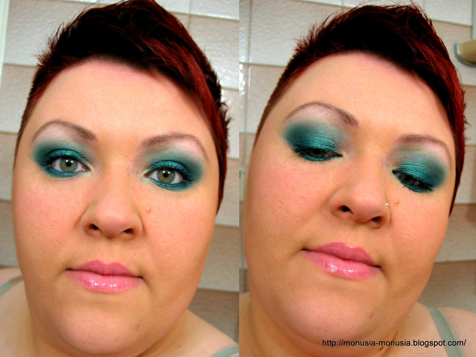 Oczy robią tu tak naprawdę całą robotę więc aby nie przesadzić na ustach mleczny róż (Essence Stay with Me Longlasting Lipgloss nr 01 Me & My IceCream), bo turkus lubi się z takim kolorem na ustach. I to wszystko.