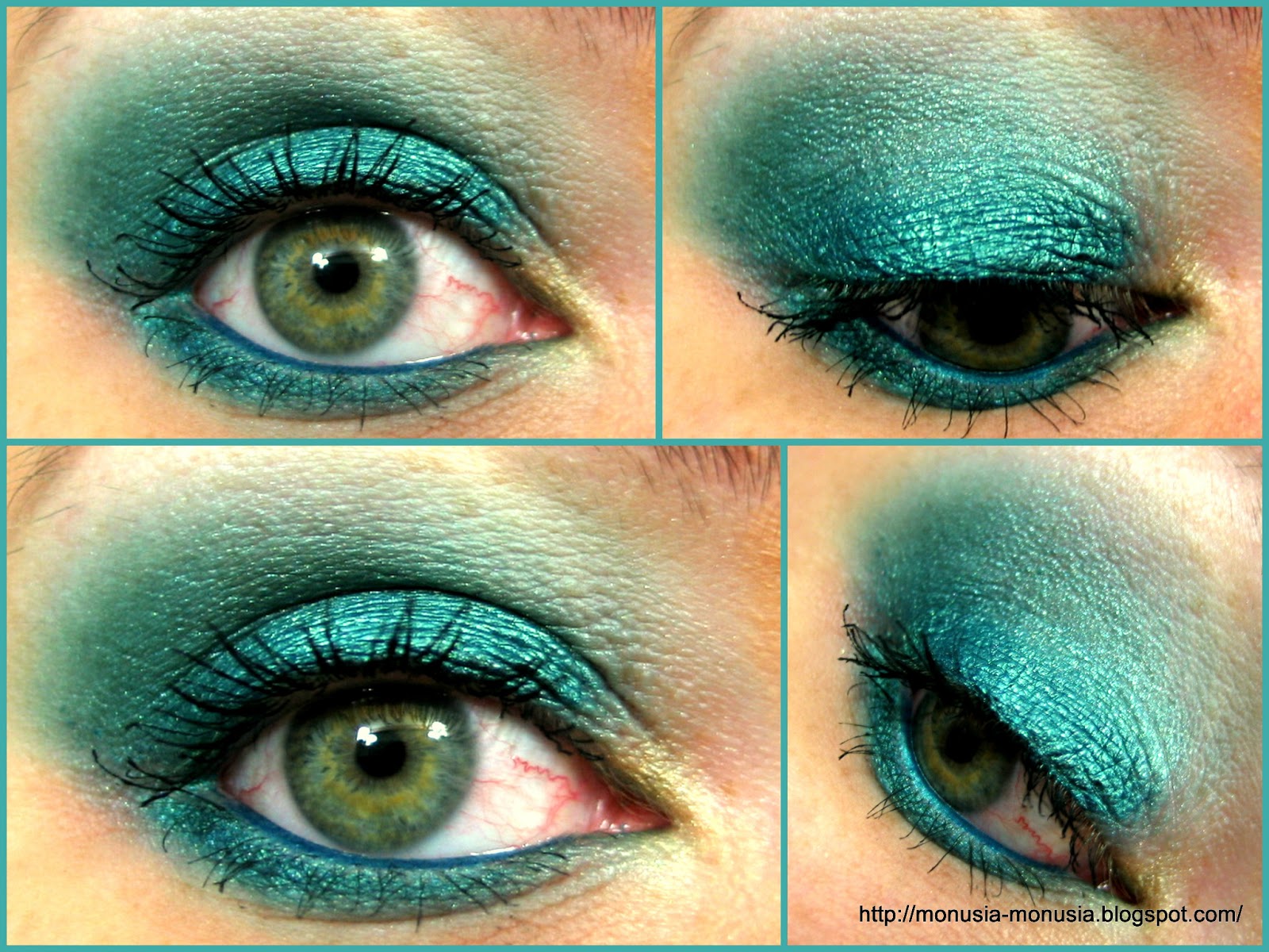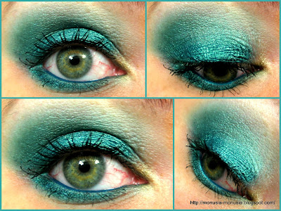 Użyłam tylko jednego cienia, ale za to w elektryzującym odcieniu szmaragdowego turkusu z paletki Sleek Jewels. Jako bazy użyłam turkusowej kredki (Avon SuperShock Gel Eyeliner Aqua Pop KLIK), aby jeszcze bardziej zintensyfikować odcień. Turkus nałożyłam na całą powiekę i dobrze roztarłam ponad załamanie pomagając sobie matowym beżem (Inglot 353 M). Na linię wody nałożyłam tą samą kredkę, która posłużyła mi jako baza. Kąciki wewnętrzne lekko rozświetliłam złotem z tej samej paletki tylko dla kontrastu.