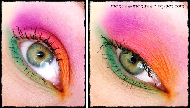 Użyłam oczywiście paletki Sleek Ultra Mattes V1 Brights. Zaczynając od wewnętrznej części oka na ruchomą powiekę nałożyłam pomarańcz (paletka Sleek Brights, cień Strike), róż (paletka Sleek Brights, cień Pout), a na koniec w zewnętrznym kąciku oka oraz w załamaniu powieki fiolet (paletka Sleek Brights, cień Sugarlite). Górną granicę fioletu roztarłam bladym różem (paletka Sleek Brights, cień Floss), a pod sam łuk brwiowy nałożyłam cielisty cień (paletka Sleek Brights, cień Pow!). Na dolną powiekę nałożyłam jasną zieleń (paletka Sleek Brights, cień Cricket) oraz ciemną zieleń (paletka Sleek Brights, cień Dragon Fly), który wyciągnęłam w zewnętrznym kąciku.