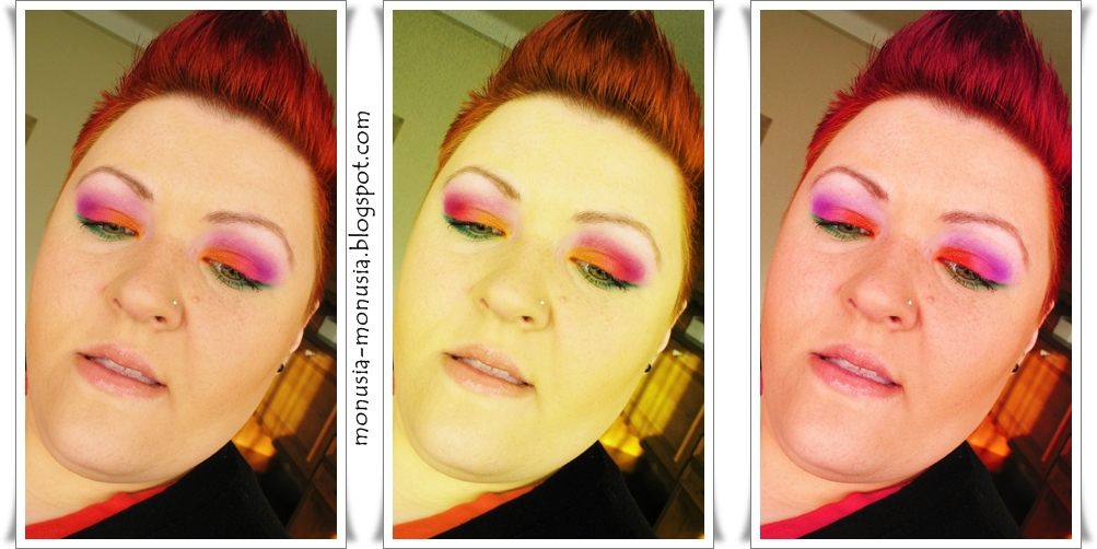 Użyłam oczywiście paletki Sleek Ultra Mattes V1 Brights. Zaczynając od wewnętrznej części oka na ruchomą powiekę nałożyłam pomarańcz (paletka Sleek Brights, cień Strike), róż (paletka Sleek Brights, cień Pout), a na koniec w zewnętrznym kąciku oka oraz w załamaniu powieki fiolet (paletka Sleek Brights, cień Sugarlite). Górną granicę fioletu roztarłam bladym różem (paletka Sleek Brights, cień Floss), a pod sam łuk brwiowy nałożyłam cielisty cień (paletka Sleek Brights, cień Pow!). Na dolną powiekę nałożyłam jasną zieleń (paletka Sleek Brights, cień Cricket) oraz ciemną zieleń (paletka Sleek Brights, cień Dragon Fly), który wyciągnęłam w zewnętrznym kąciku.