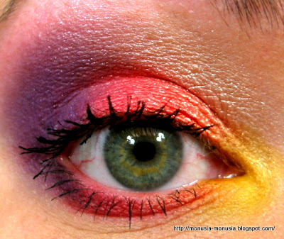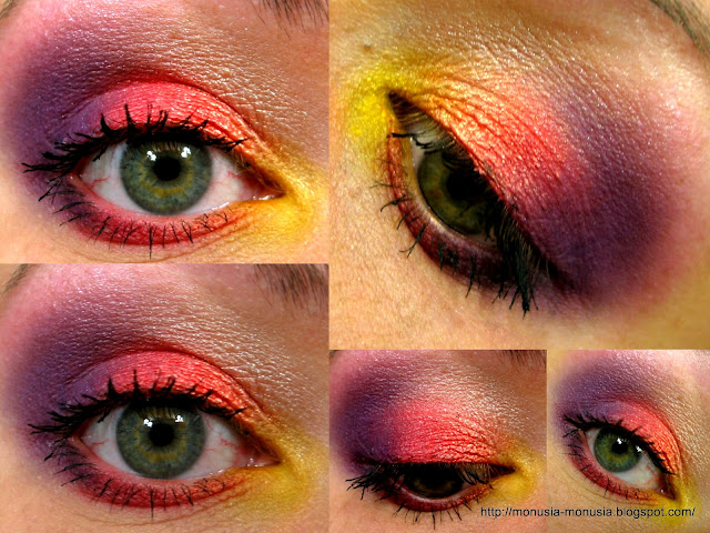 Żeby uzyskać fajne przejścia kolorów zaczęłam od: żółtego kącika wewnętrznego (paletka Sleek Curacao, cień Screwdriver), następnie błyszcząca pomarańcza (paletka Sleek Paraguaya, cień Persian Orange), pomidorowa czerwień (paletka Sleek Curacao, cień Bloody Mary), kończąc na fioletowym kąciku zewnętrznym (paletka Sleek Curacao, cień Purple Haze). Wewnętrzną część załamania rozświetliłam lekko różowym cieniem (paletka Sleek Paraguaya, cień Parfait), a na matową żółć dodałam parę iskierek (paletka Sleek Paraguaya, cień Bellini). Górną granicę fioletu musnęłam mocnym różem (paletka Sleek Curacao, cień Singapore Sling).