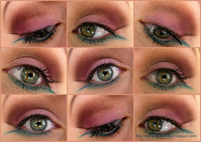 Zawsze zaczynam od załamania, a tam znalazł swoje miejsce brąz (cień Paper Bag), na całą powiekę nałożyłam lawendowy mat z paletki Sleek Circus, zewnętrzny kącik przyciemniłam śliwką (cień Villan). Wszystko wokół roztarłam dokładnie cielistym matem (cień Dune), który też znalazł się w wewnętrznym kąciku. Kreskę górną zrobiłam oczywiście czarnym matem (cień Noir), a dolną pięknym turkusem (cień Orbit).