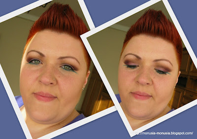 Przy takich oczach wydaje mi się, że nie ma sensu już nic więcej szaleć na twarzy. Tylko podkład (Pharmaceris F Fluid matujący z laktoflawiną SPF 20 w kolorze 02 Natural) i lekko wykonturowane policzki bronzerem (e.l.f. Healthy Glow Bronzing Powder w kolorze Warm Tan). A że już się troszeczku śpieszyłam to nawet nie nałożyłam nic na usta – tym razem są gołe ;o)