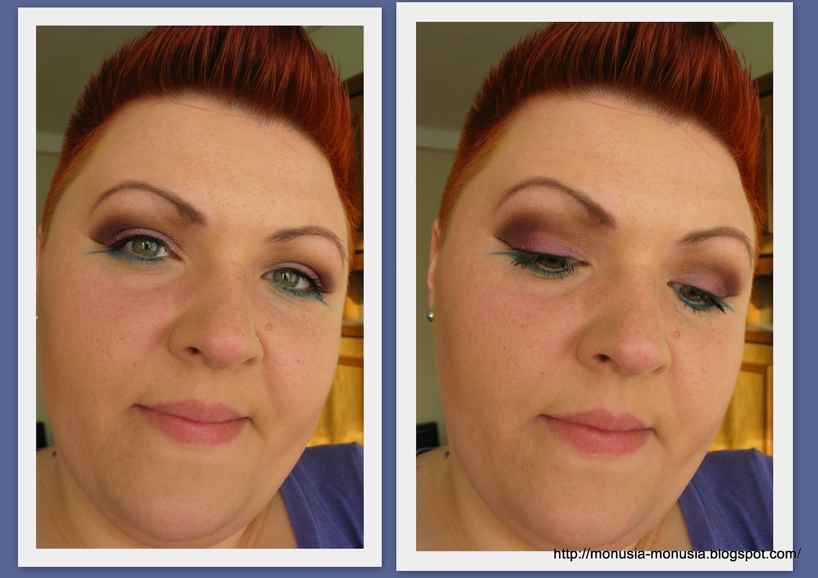Zawsze zaczynam od załamania, a tam znalazł swoje miejsce brąz (cień Paper Bag), na całą powiekę nałożyłam lawendowy mat z paletki Sleek Circus, zewnętrzny kącik przyciemniłam śliwką (cień Villan). Wszystko wokół roztarłam dokładnie cielistym matem (cień Dune), który też znalazł się w wewnętrznym kąciku. Kreskę górną zrobiłam oczywiście czarnym matem (cień Noir), a dolną pięknym turkusem (cień Orbit).
