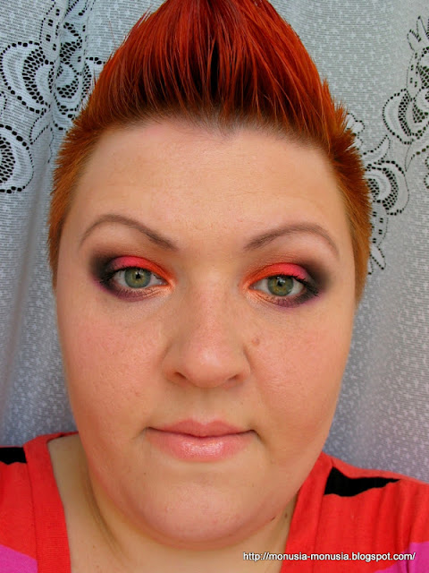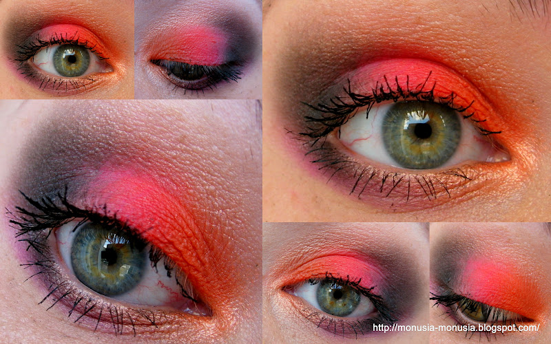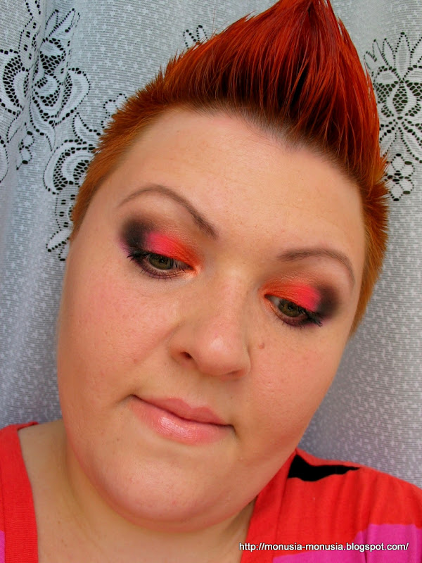 Zainspirowałam się kolorystyką – połączenie pomarańczy, różu i czerni. Wykonanie to już czyta improwizacja. Na 1/3 górnej powieki nałożyłam matowy, dość mocny pomarańcz (paletka Sleek Paraguaya, cień Tangelo). Na środku powieki wylądował ostry, matowy róż (paletka Sleek Ultra Mattes V1 Brights, cień Pout). Zewnętrzny kącik pokreśliłam bardzo ciemnym (prawie czarnym) grafitem (paletka Sleek Bad Girl, cień Underground). Sięgnęłam po perłowy pomarańcz (paletka Sleek Paraguaya, cień Persian Orange), rozświetliłam nim wewnętrzny kącik i pociągnęłam go wzdłuż załamania łącząc z grafitem w zewnętrznym kąciku oka. Dolną powiekę podkreśliłam wcześniejszym grafitem, a roztarłam go w dół matowym fioletem (paletka Sleek Ultra Mattes V1 Brights, cień Sugarlite), aby uzyskać smugę koloru. Pod łuk brwiowy już coś w miarę neutralnego (paletka Sleek Paraguaya, cień Sand Stone).