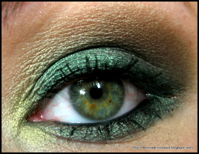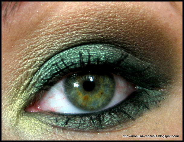 Zaczynam od zaznaczenia załamania powieki zgniłą, wojskową zielenią (Inglot 419 Pearl). Na całą górną i dolną powiekę nakładam odcień leśnej zieleni (Kobo 214 Forest Green) i rozcieram tak aby wtopić ją w zgniłą zieleń w załamaniu. Zewnętrzny kącik przyciemniam ciepłym brązem (Inglot 409 Pearl). Wewnętrzny kącik zaś rozświetlam i nadaje koloru złotą zielenią (Inglot 411 Pearl). Łuk brwiowy rozjaśniam beżem ze złotymi drobinkami (Inglot 463 Double Sparkle). Na górną linię rzęs oraz górną i dolną linię wodną nakładam czarną kredkę (Avon SuperShock Gel Eyeliner Pencil Black).