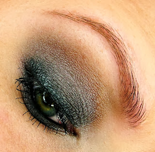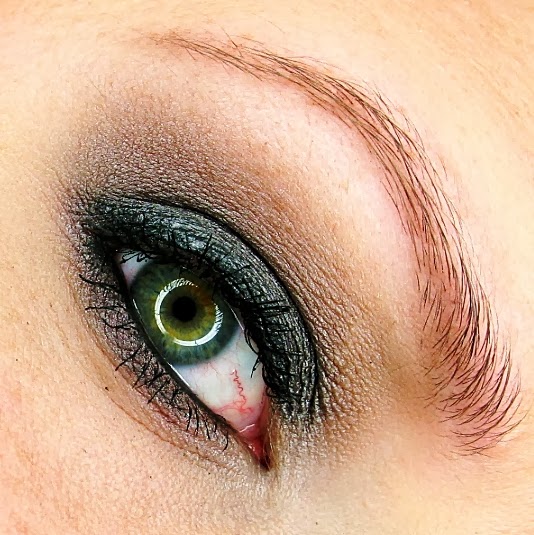 Zaczynam od czarnej bazy, którą nakładam na całą powiekę ruchomą (Maybelline Color Tattoo 24HR #60 Timeless Black) i rozcieram w kierunku załamania. Kolejno nakładam zimne brązy (Inglot 434 P + Inglot 435 P) na całą powiekę ruchomą i rozcieram ku górze. Ocieplam odrobinę załamanie powieki brązem (Inglot 457 DS), a wszystkie kontury makijażu oka mocno i dokładnie rozcieram cielistym cieniem (Inglot 353 M). Wewnętrzne kąciki rozjaśniam brązem w kolorze taupe (Inglot 408 P). Na górnej linii rzęs rysuję czarną kreskę (Avon SuperShock Gel Eyeliner Pencil #Black) i przyciemniam dodatkowo cały makijaż rozcierając ją czarnym cieniem (Inglot 391 M). Górną i dolną linię wody maluję na czarno.