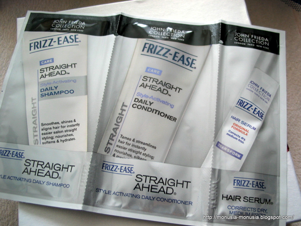 Zestaw próbek John Frieda Collection – czyli 3 stepy – Szampon prostujący i wygładzający, odżywka prostująca i wygładzająca oraz serum regenerujące włosy suche i zniszczone – może troszeczkę nie trafione w akurat mój typ włosów, ale mogę troszeczkę podrasować swój stan włosów, a czemu nie!