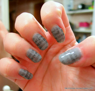 Metoda sama w sobie bardzo prosta w wykonaniu. Malujemy paznokcie lakierem bazowym (mój to szaraczek Wibo Extreme Nails nr 81) i czekamy aż lakier wyschnie idealnie – to ważne. Następnie wycinamy z szarej gazety tekst wielkość płytki paznokcia. Każdy wycinek gazety nasączamy w spirytusie salicylowym kosmetycznym i przykładamy do paznokcia dobrze przyklepując. Odklejamy gazetę a na naszych paznokciach pozostaje tusz z napisami. Utrwalamy wszystko Top Coat’em i gotowe!