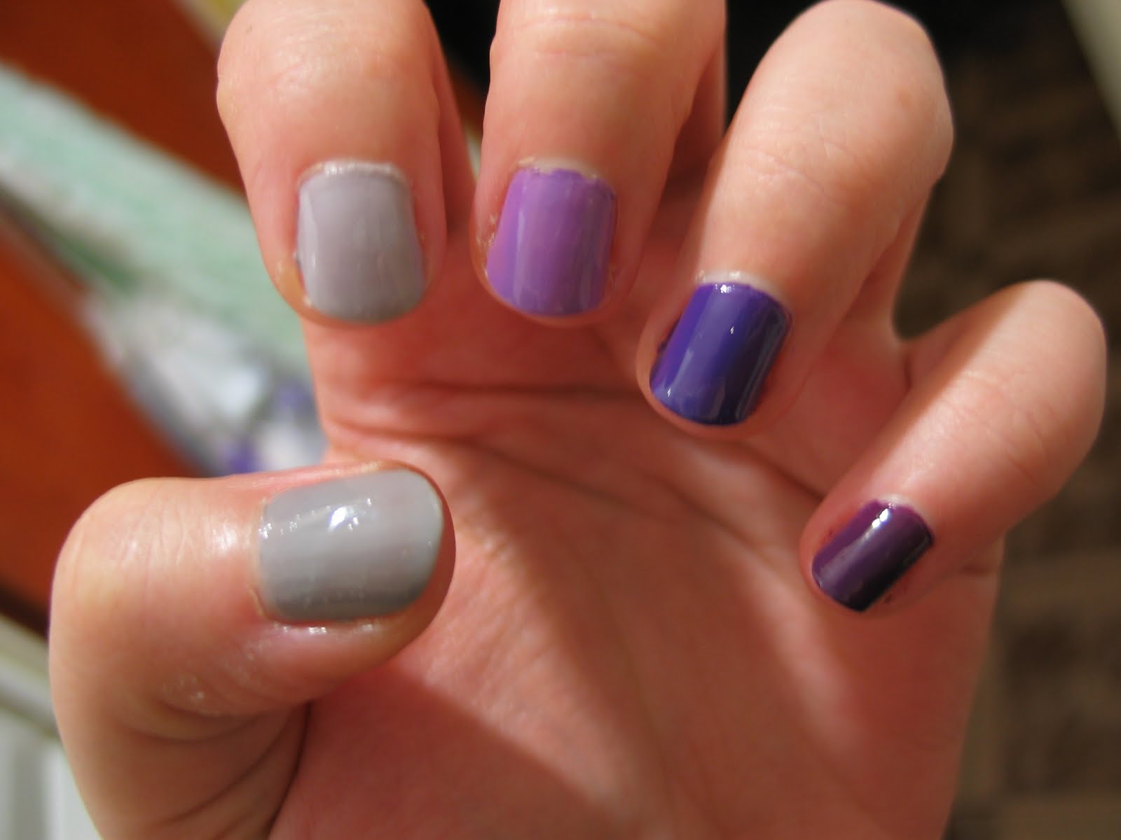 Pogrzebałam troszeczkę w swoim zbiorze lakierów i okazało się, że mam do kompletu 5 odcieni fioletu (a raczej 4, bo piąty to szary ;o) ). Moja wersja Skittle Manicure w fioletach.