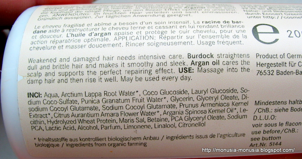 Moja opinia: Po moich ostatnich, nieudanych próbach z szamponami naturalnymi podchodziłam do tego produktu jak pies do jeża. Wiecie jak to jest z tymi organicznymi szamponami: kiepsko się pienią, żeby coś zmyć z głowy trzeba użyć ich przynajmniej 2-3 razy jak nie 4. A tutaj nagłe ZASKOCZENIE! Pięknie się pieni, żeby zmyć z głowy moją tonę lakieru do włosów wystarczy umyć głowę 2 razy. Włosy są fajne, sypkie, ale jednocześnie czuć pod palcami, że mocno oczyszczone więc mogą się troszeczkę plątać, ale to normalne w przypadku takich szamponów. Produkt sam w sobie bardzo gęsty i treściwy o charakterystycznym zapachu. Olejek arganowy naprawdę działa zbawiennie na skórę głowy. Skóra świetnie się oczyszcza i regeneruje. Jeśli chodzi o właściwości chronienia koloru niestety takich nie zauważyłam, ale też nie przyspiesza wypłukiwania koloru. Ten szampon przywrócił mi wiarę i sens szamponów organicznych. Odczarował mi złe myślenie o takich produktach. Wart wypróbowania.