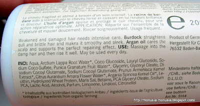Od producenta: Z korzeniem łopianu i olejkiem arganowym – dla osłabionych i farbowanych włosów. Osłabione i farbowane włosy potrzebują intensywnej pielęgnacji i odżywienia. Wyciąg z korzenia łopianu wzmacnia matowe i łamliwe włosy, które stają się wygładzone i lśniące. Olejek arganowy ma zbawienne działanie na skórę głowy i wspiera efekt doskonałej naprawy. Delikatna formuła dla wrażliwej skóry. Cena: 21,50 zł.