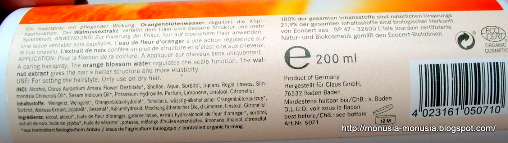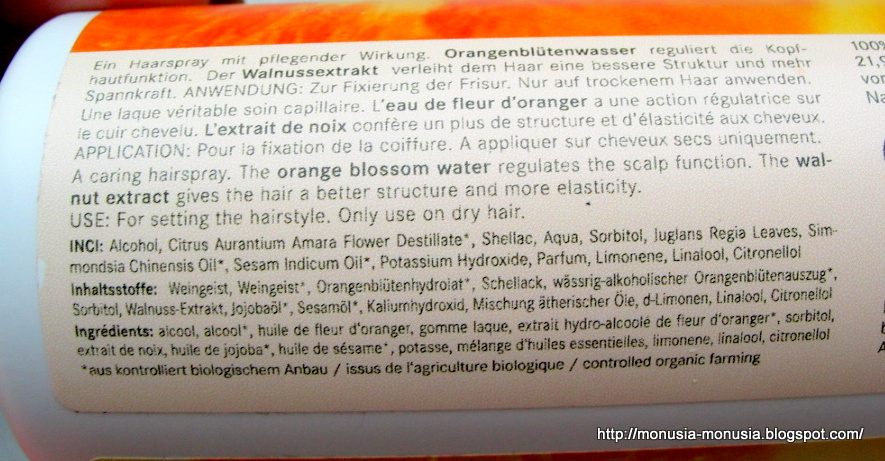 Moja opinia: Bardzo fajny i przyjemny lakier do włosów. Oczywiście nie jest to mocno utrwalający lakier, ale idealny do tego, aby nadać fryzurze odpowiedni kształt, łatwo się nim stylizuje – osobiście lubię taką właściwość w lakierze. Przepięknie pachnie pomarańczą, a taki zapach w lakierze to rzadkość. Tym lakierem ujarzmicie niesforne, wystające kosmyki włosów czy też ułożycie perfekcyjnie grzywkę. Na pewno przypadnie do gustu tym z Was, które lubią naturalny look na swoich włosach np utrwalić własne loki czy też wyprostowane włosy. Naprawdę zawarta w tym sprayu woda z kwiatu pomarańczy reguluje pracę skóry głowy. Zero łupieżu itd.