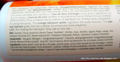 Od producenta: Z wodą z kwiatu pomarańczy i ekstraktem z orzecha włoskiego. Pielęgnujący spray do stylizacji włosów. Woda z kwiatu pomarańczy reguluje pracę skóry głowy. Wyciąg z orzecha włoskiego dodaje włosom elastyczności i poprawia ich strukturę. Cena: 39,80 zł.