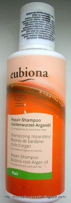 Ostatnim z całej trójcy jest EUBIONA ODBUDOWUJĄCY SZAMPON DO WŁOSÓW OSŁABIONYCH I FARBOWANYCH (OSET+OLEJEK ARGANOWY) 200 ml