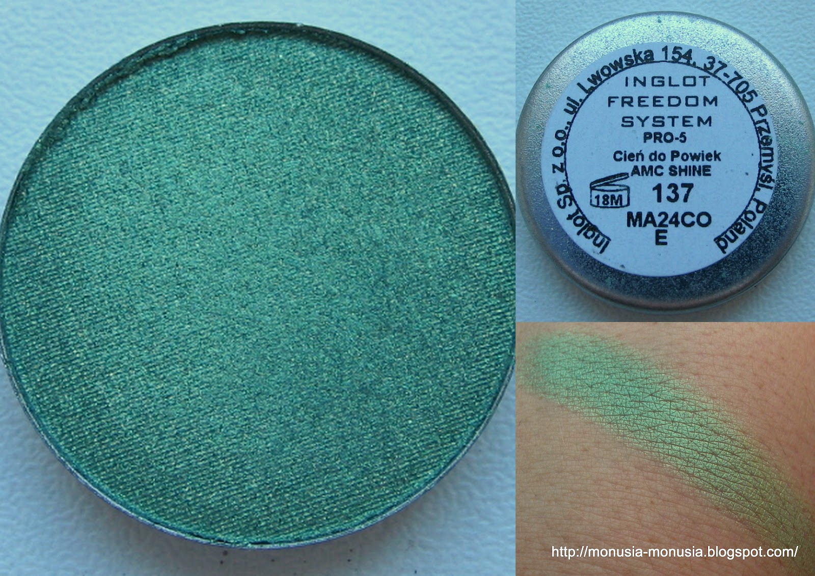| Inglot 137 AMC Shine – średni kolor zieleni, w bardziej stonowanym odcieniu, ze złotym pobłyskiem |