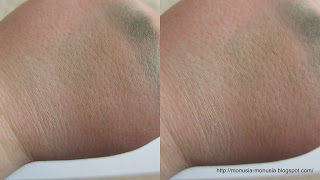 Cienie mają formułę satynowo-perłową więc to nie jest taka typowa mocna perła. Ale pigmentacja jest OKROPNA!!! A raczej jej nie ma! Cień nr 1 czyli perłowa biel opalizująca na złoto – z tej bieli na powiece zostaje tylko ten nieszczęsny złoty poblask. Cień nr 2 i 3 czyli ta złota i zgniła zieleń jeśli są obok siebie (tak jak tu na swatchu) różnią się od siebie, ale na oku to jedna wielka zielona breja więc równie dobrze możecie położyć jeden z tych cieni, nie widać różnicy. Jedyne co nadawało by się do jakiegoś użytku to cień nr 4 ciemna zieleń, ale dlatego wypada lepiej od swoich kolegów z quadu ponieważ jest najciemniejsza, a i tak tworzy niezłe prześwity na oku.