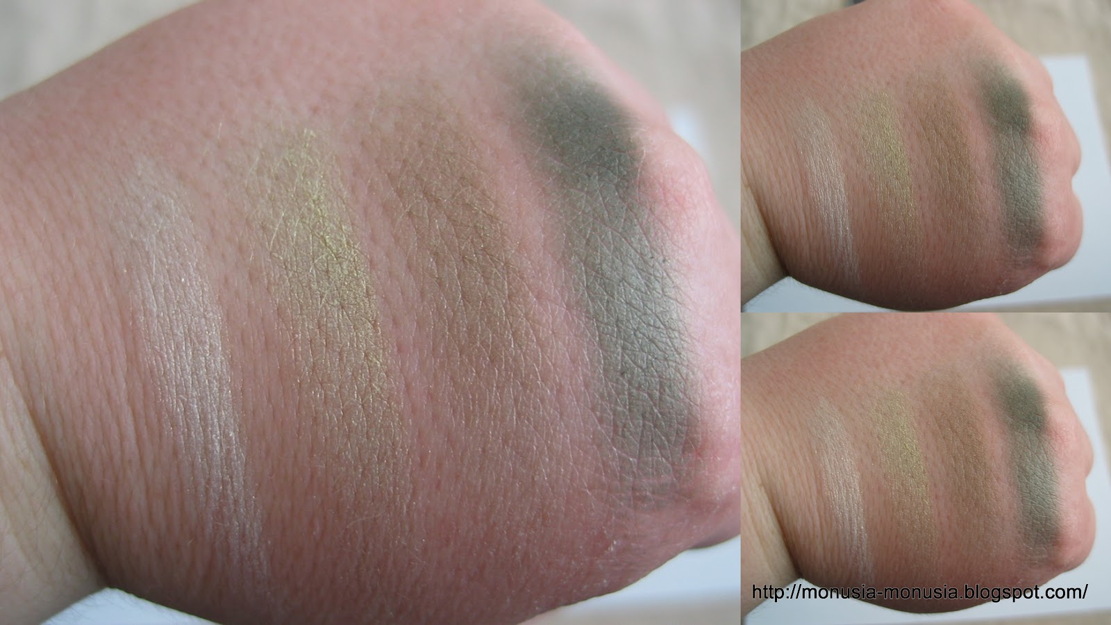 Cienie mają formułę satynowo-perłową więc to nie jest taka typowa mocna perła. Ale pigmentacja jest OKROPNA!!! A raczej jej nie ma! Cień nr 1 czyli perłowa biel opalizująca na złoto – z tej bieli na powiece zostaje tylko ten nieszczęsny złoty poblask. Cień nr 2 i 3 czyli ta złota i zgniła zieleń jeśli są obok siebie (tak jak tu na swatchu) różnią się od siebie, ale na oku to jedna wielka zielona breja więc równie dobrze możecie położyć jeden z tych cieni, nie widać różnicy. Jedyne co nadawało by się do jakiegoś użytku to cień nr 4 ciemna zieleń, ale dlatego wypada lepiej od swoich kolegów z quadu ponieważ jest najciemniejsza, a i tak tworzy niezłe prześwity na oku.