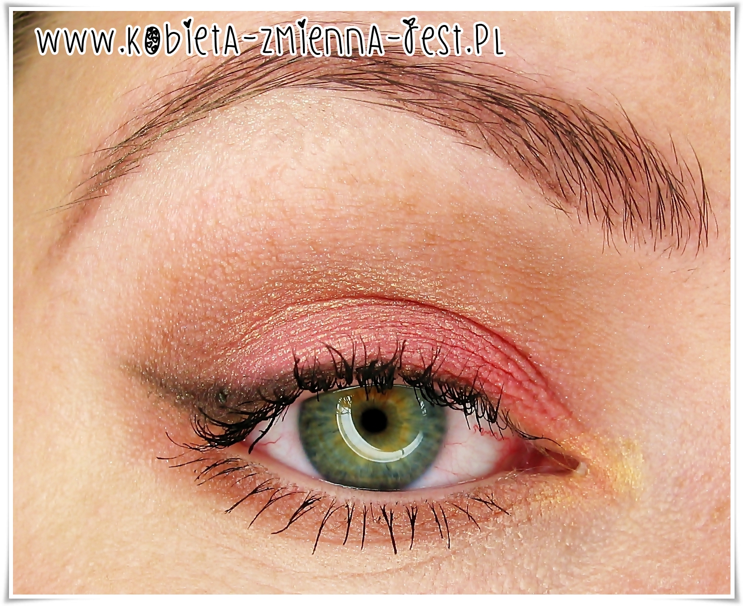 Zaczynam od bronzera: nakładam go w załamaniu powieki i na dolną powiekę (w moim przypadku Makeup Revolution Bronzer Medium Matte). Następnie na całą powiekę górną nakładam róż do policzków (Makeup Revolution Ultra Blush and Contour Palette Hot Spice) – może być bardziej różowy lub pomarańczowy w zależności od tego jaki mamy typ urody. Na koniec złoty rozświetlacz (Makeup Revolution Highlighter Golden Lights), który nakładam na środek powieki dla delikatnego błysku oraz delikatnie pod łukiem brwiowym w najwyższym jego punkcie. Dla urozmaicenia dodałam delikatną kreseczkę czarnym cieniem (Inglot 391 M) i złoty cień w kąciku wewnętrznym (Hean 825), ale to już opcjonalnie.