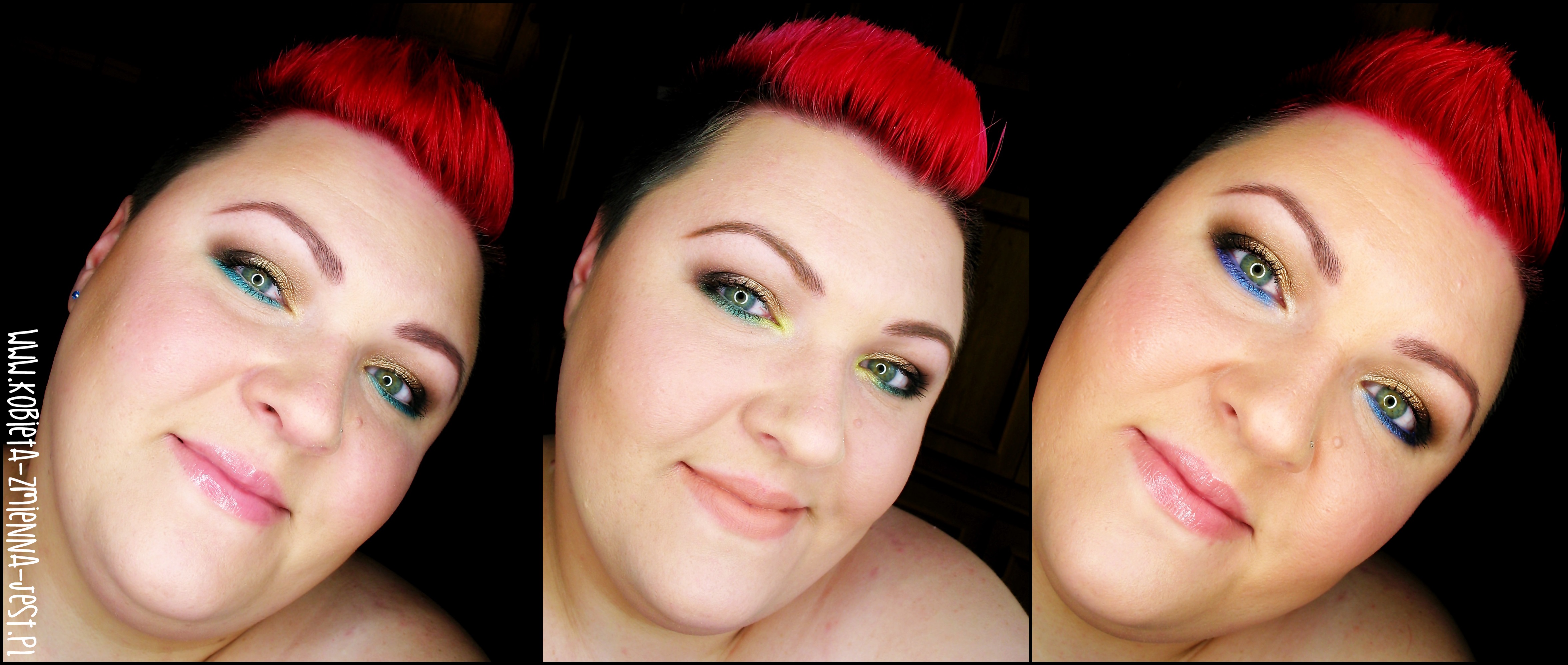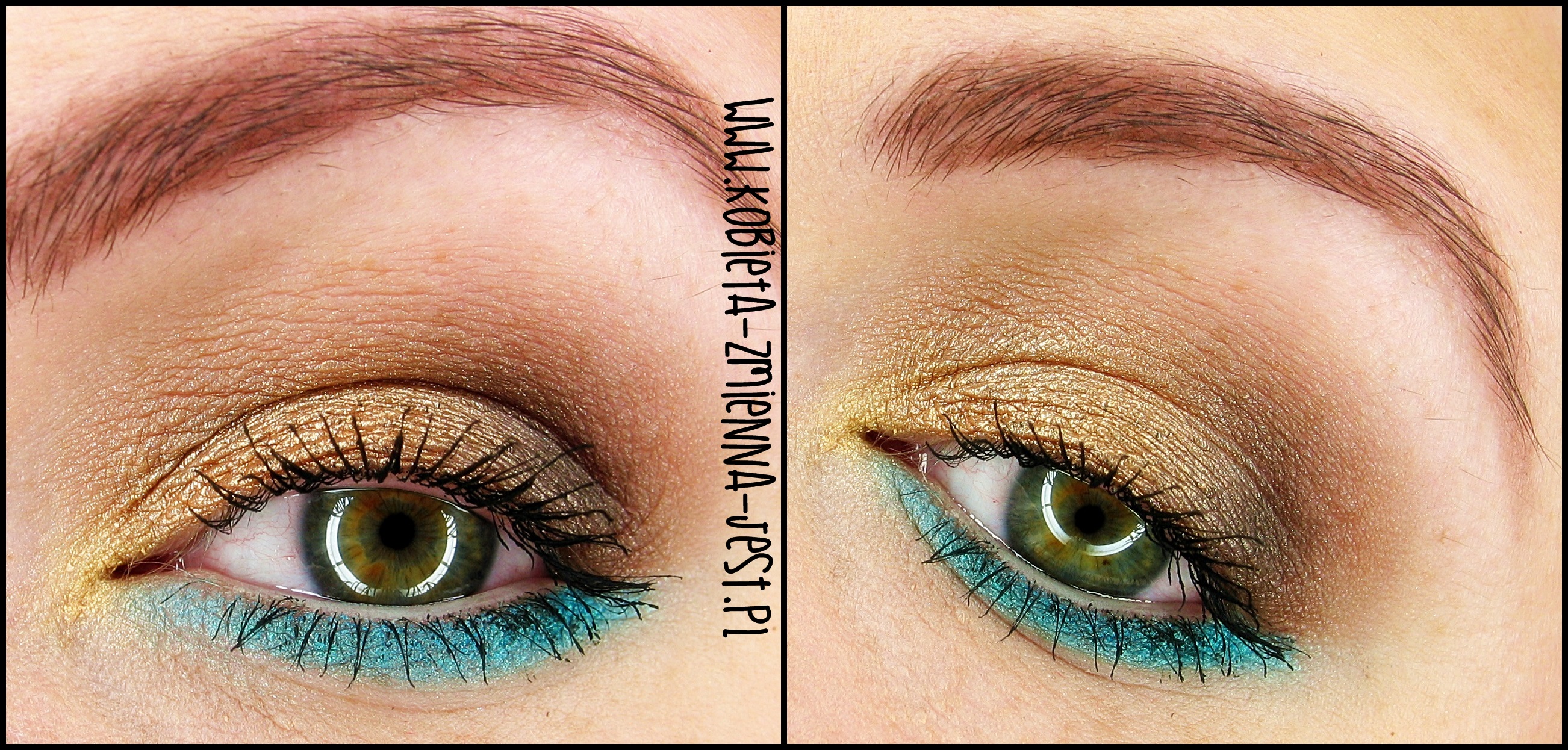 Pomysł sam w sobie jest banalny! Wystarczy zmalować górną powiekę w kolorach nude (moją bazą we wszystkich makijażach jest wersja brązu ze złotem z postu TUTAJ). Cała zabawa polega na dolnej, kolorowej powiece! Co tam nałożycie zależy już od Was: czy to kolory, które będą pasować do Waszego ubioru, czy też będą podkreślać kolor Waszej tęczówki albo też kolor, na który właśnie macie ochotę.